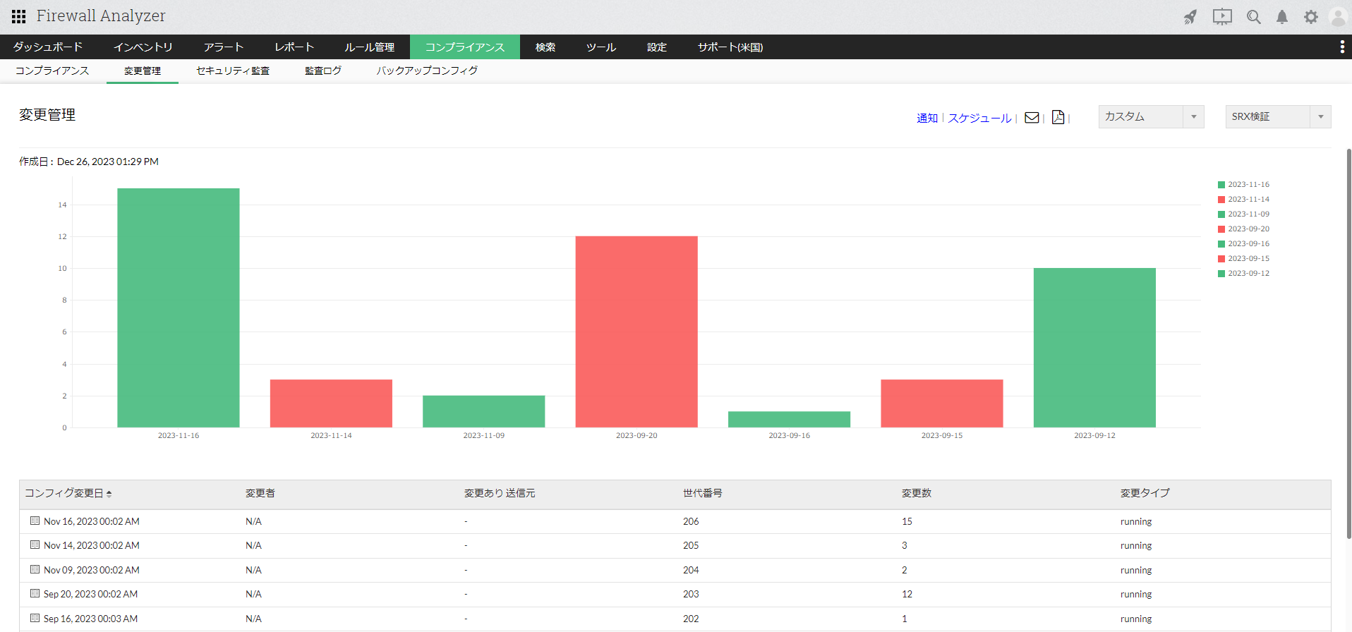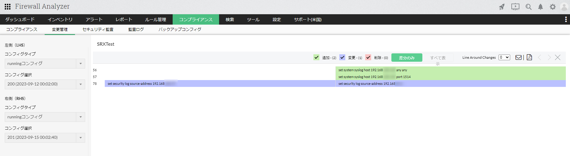 管理対象のファイアウォールに設定されているコンフィグに変更があった場合に自動検知し、変更日時とコンフィグ世代の表示、コンフィグ間の差分を確認します。
