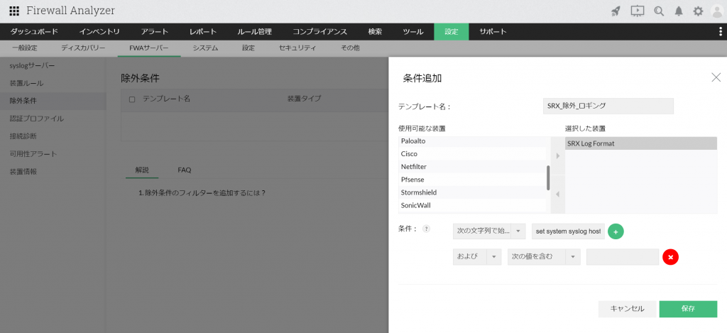 設定画面:[設定]→[FWAサーバー]→[除外条件]
