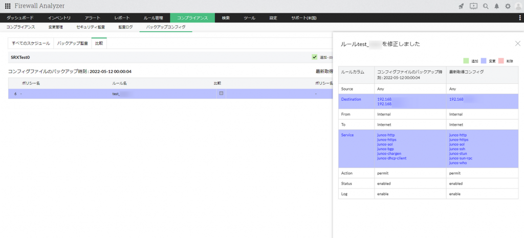 [比較]画面では、スケジュールバックアップで取得したコンフィグ情報をもとに、ファイアウォールに設定されているルール(ポリシー)またはコンフィグを対象に差分を表示します。