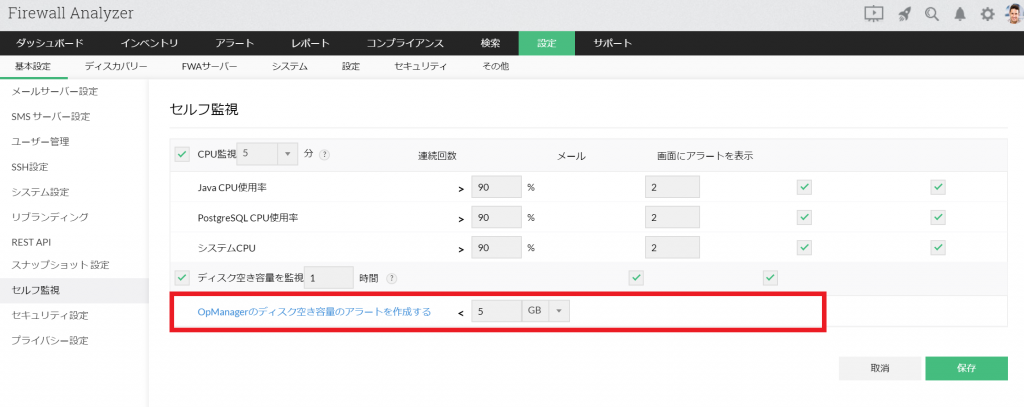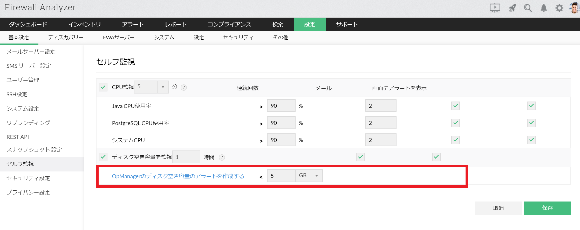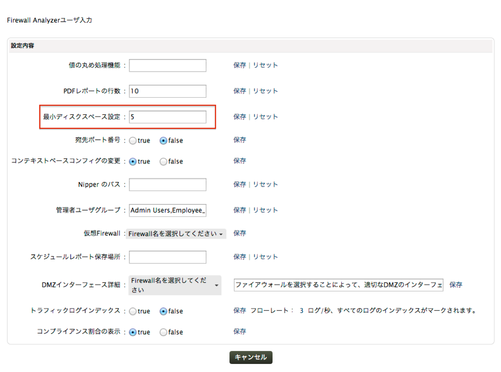 administrator権限のユーザーでログイン後、「http://<Firewall Analyzer>:8500/fw/userConfig.do」へアクセスし、[最小ディスクスペース設定]の値を変更してください。