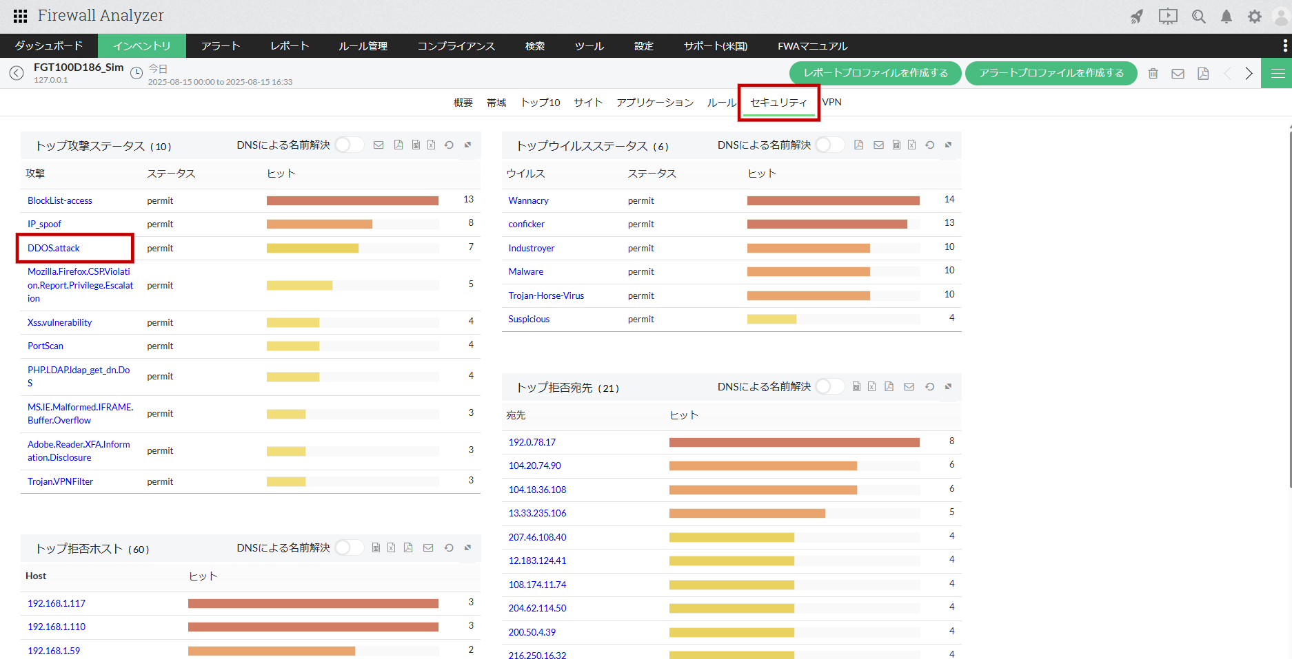 - ダッシュボード画面を確認することで、攻撃名、ウイルス名ごとに、件数を一覧で表示します。
