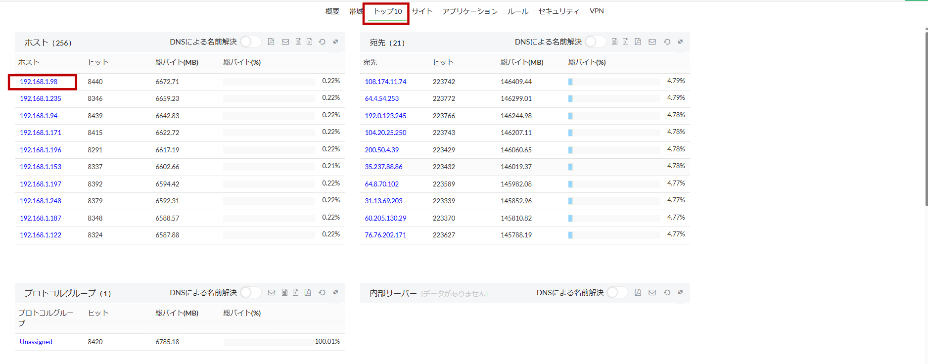 [トップ10]タブから、通信量の多いホストやプロトコル情報を表示