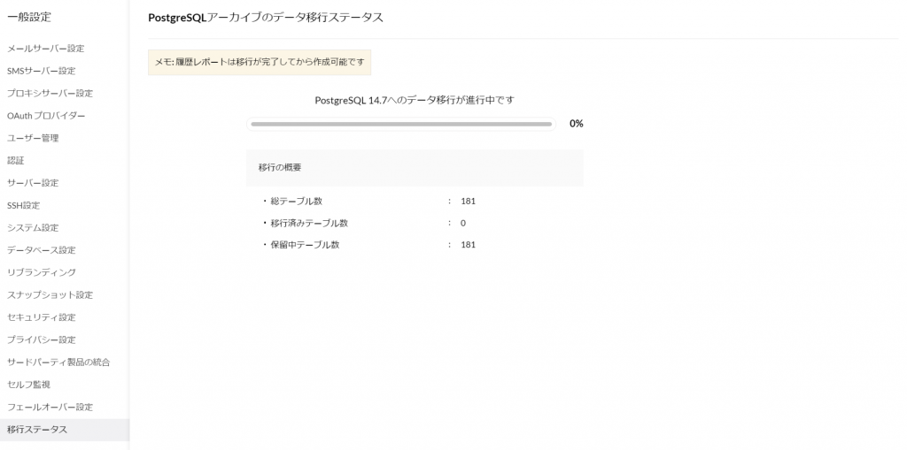 - PostgreSQLのアップグレードに伴いデータ移行が進行している場合、完了まで待機