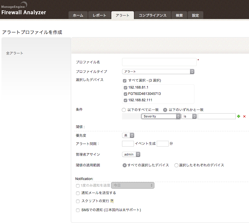Firewall Analyzerは、指定した条件に一致したログを受信するとアラートとして発報する機能「アラートプロファイル」が実装されています。