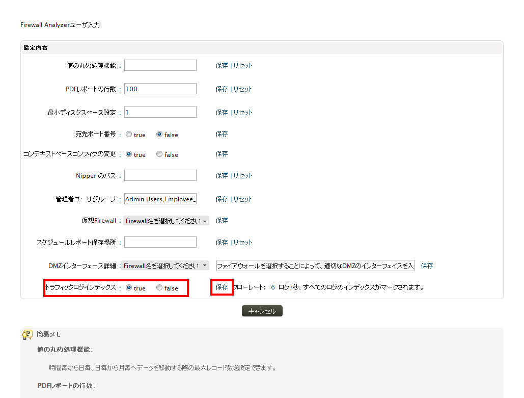<Firewall AnalyzerのIPアドレス>:インストールしたサーバーのIPアドレスまたはホスト名を指定します。 - [トラフィックログインデックス」を[true」にし、設定を保存