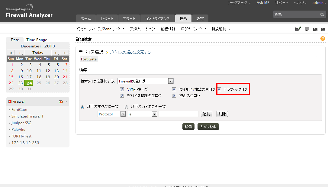 上記設定を保存すると、[検索]画面で検索タイプ[Firewallの生ログ]で、トラフィックログを検索対象として選択できるようになります。