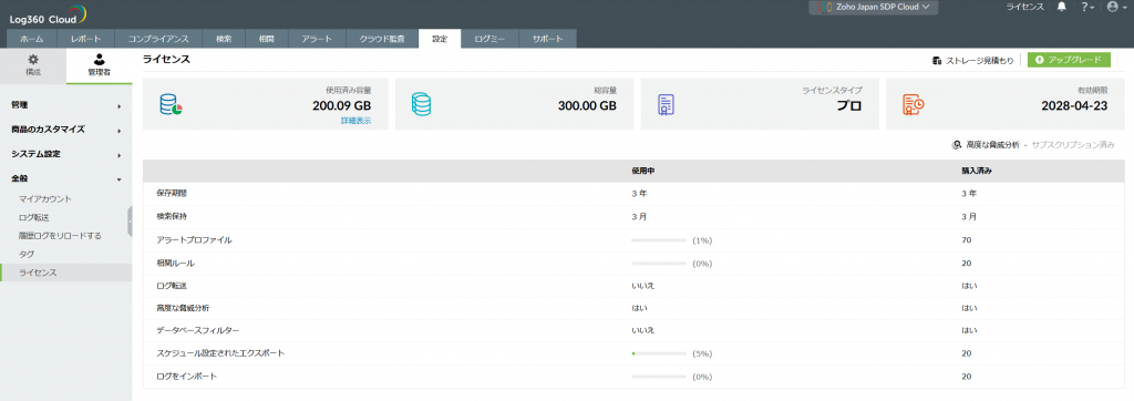 ※[レポート]タブ → 画面左下の[スケジュール設定されたレポート]で有効化されているスケジュールレポートの数をカウントしています。 - ログをインポート:ログインポートの利用状況
