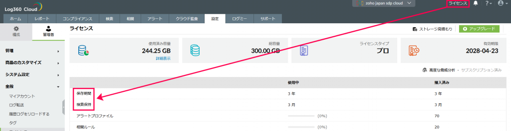 Log360 Cloudから管理対象デバイスを削除した場合、Log360 Cloudは該当デバイスのログを即座に削除しません。削除したデバイスのログも、画面右上の[ライセンス]をクリック後の[保存期間]の設定に基づいて削除されます。そのため、管理対象デバイスを削除しても、保存期間が経過するまでは削除したデバイスも容量(ストレージ)を消費します。