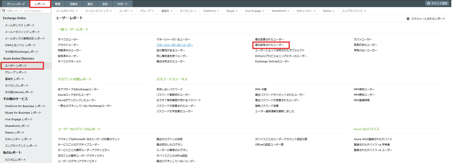 | ユーザー管理ロールが割り当てられているアカウントでMicrosoft Entra管理センターにサインインします。 | M365 Manager Plus にログインし、[レポート]→[Azure Active Directory]→[ユーザーレポート] に移動して、[最近削除されたユーザー]をクリックします。 |