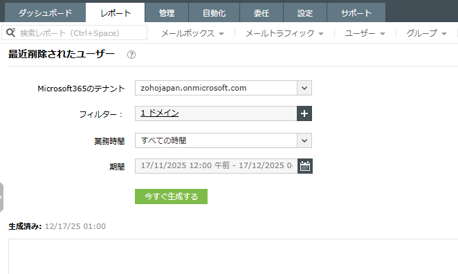 M365 Manager Plusでは、特定の日付以前だけでなく、特定の期間内に削除されたユーザーのリストも生成できます。以下の手順に従い、M365 Manager Plusを使用してMicrosoft Entra IDで最近削除されたユーザーのリストを生成してください。