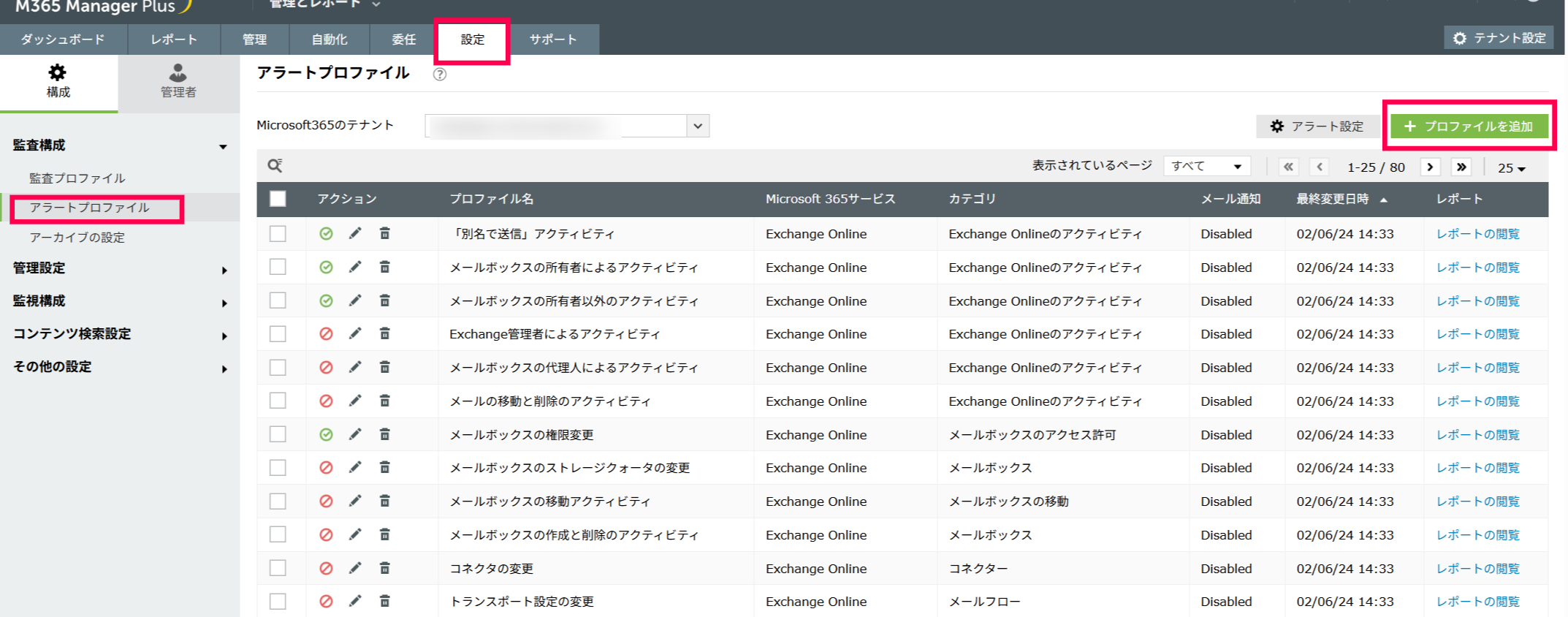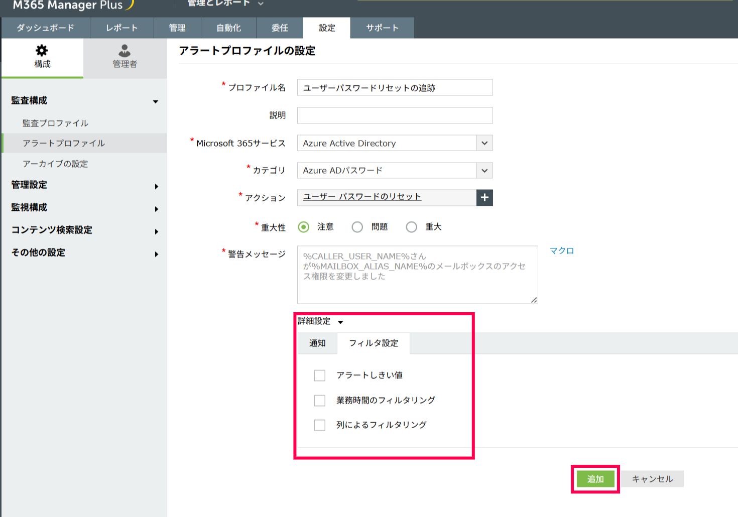 - M365 Manager Plusにログインし、[設定]タブ→[監査構成]→[アラートプロファイル]に移動し、[プロファイルを追加]をクリックします。