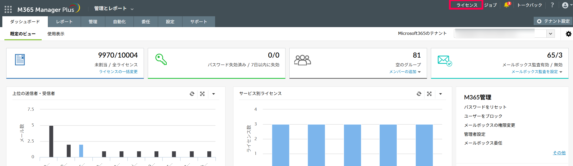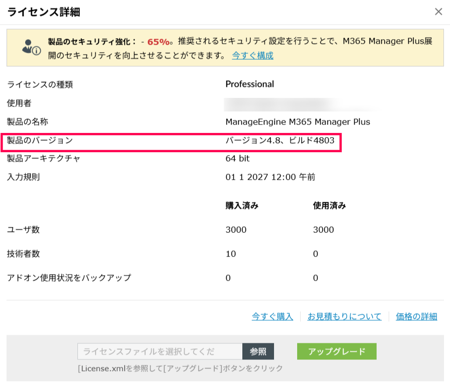 ビルド番号の確認方法 作成日:2019年8月15日 | 更新日:2026年1月26日 ライセンス ご利用中のM365 Manager Plusのバージョンとビルド番号を確認する手順は、次のとおりです。 手順 M365 Manager Plus にログインします ページ右上の「ライセンス」をクリックします ライセンス詳細ウィンドウが表示されたら、「製品のバージョン」を確認します また、「サポート」タブからもバージョンとビルド番号を確認可能です。 このナレッジの総閲覧回数: 1,906 No related posts.