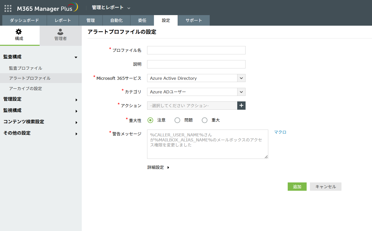 - [設定] > [監査構成] > [アラートプロファイル] > [プロファイル] > [プロファイルを追加]に移動します。