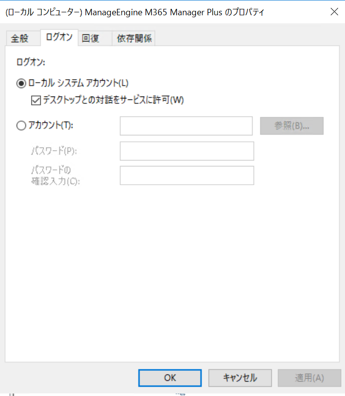 - M365 Manager Plusサービスのログオンアカウントがローカルシステム(Local System)アカウントであること