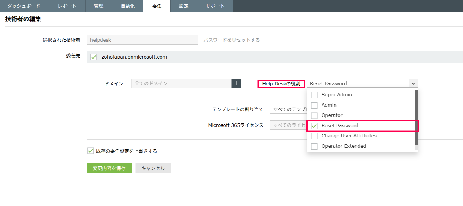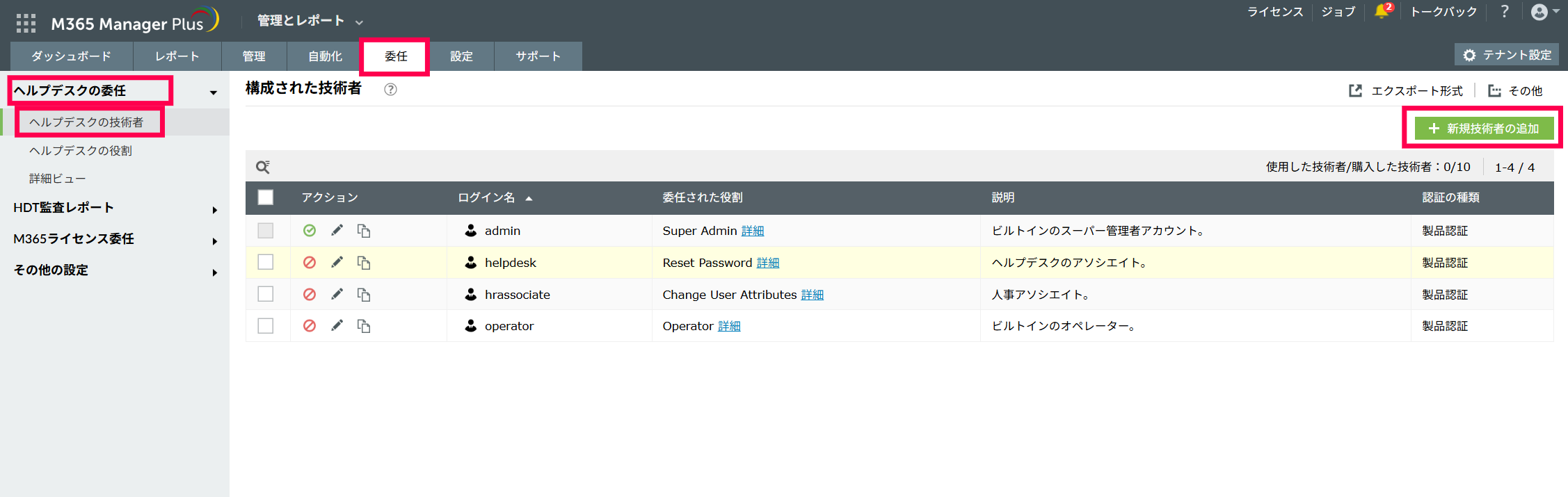 委任対象の技術者(オペレーター)がM365 Manager Plus上に登録されていない場合は新規技術者(オペレーター)へ役割を委任を参照してください。