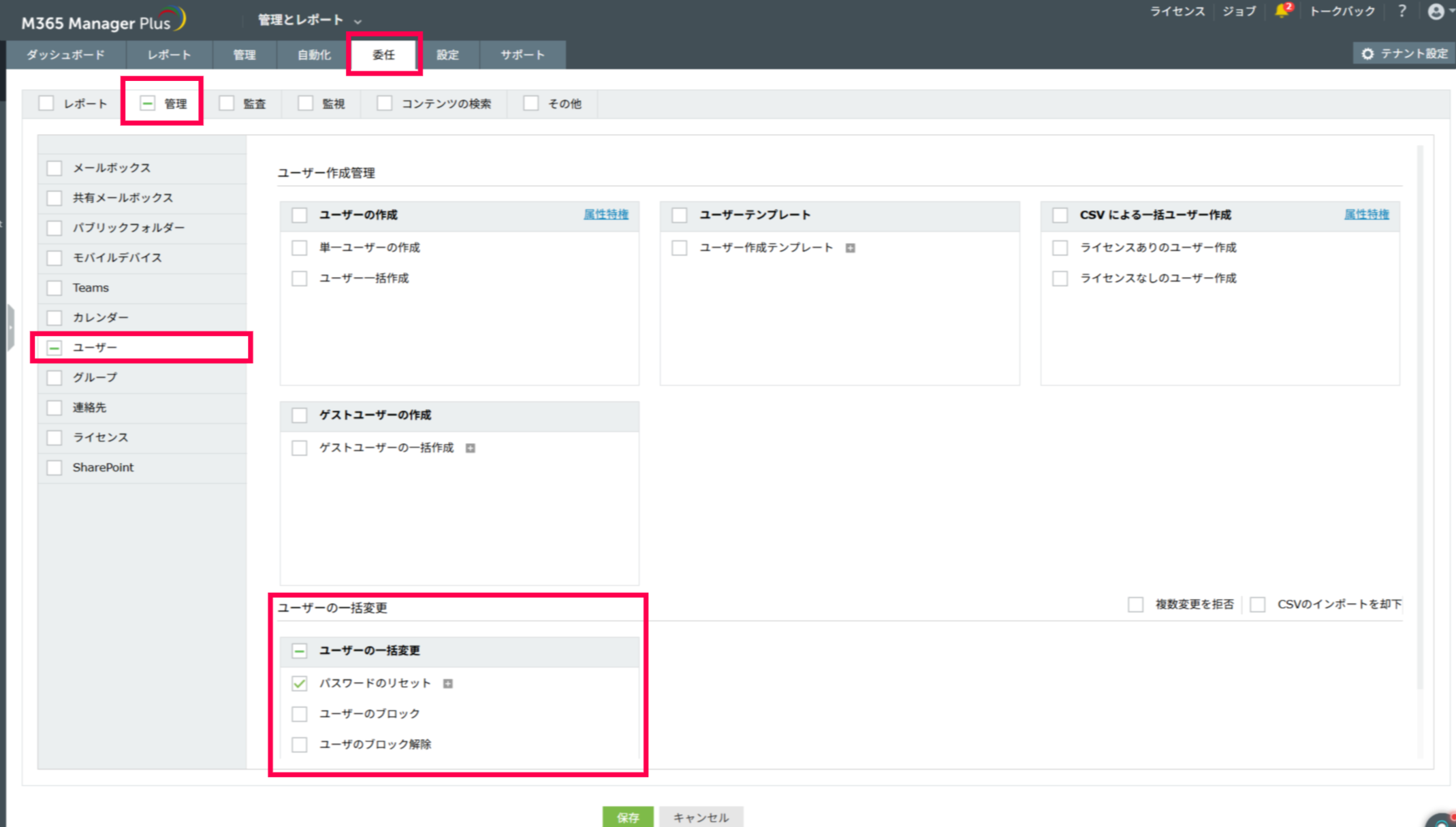 M365 Manager Plusの委任機能を活用すると、ユーザー追加、パスワードリセットなど、特定のタスクに絞ってMicrosoft 365の管理操作を委任することが可能です。