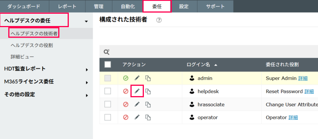 - [委任]タブ > [ヘルプデスクの委任] > [ヘルプデスクの技術者] > 委任対象の技術者の鉛筆アイコン の順にクリックします。