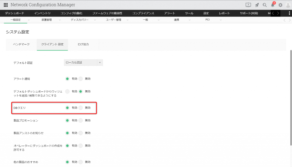 - [設定]→[一般設定]→[システム設定]→[クライアント設定]画面で[DBクエリ]を有効にして保存