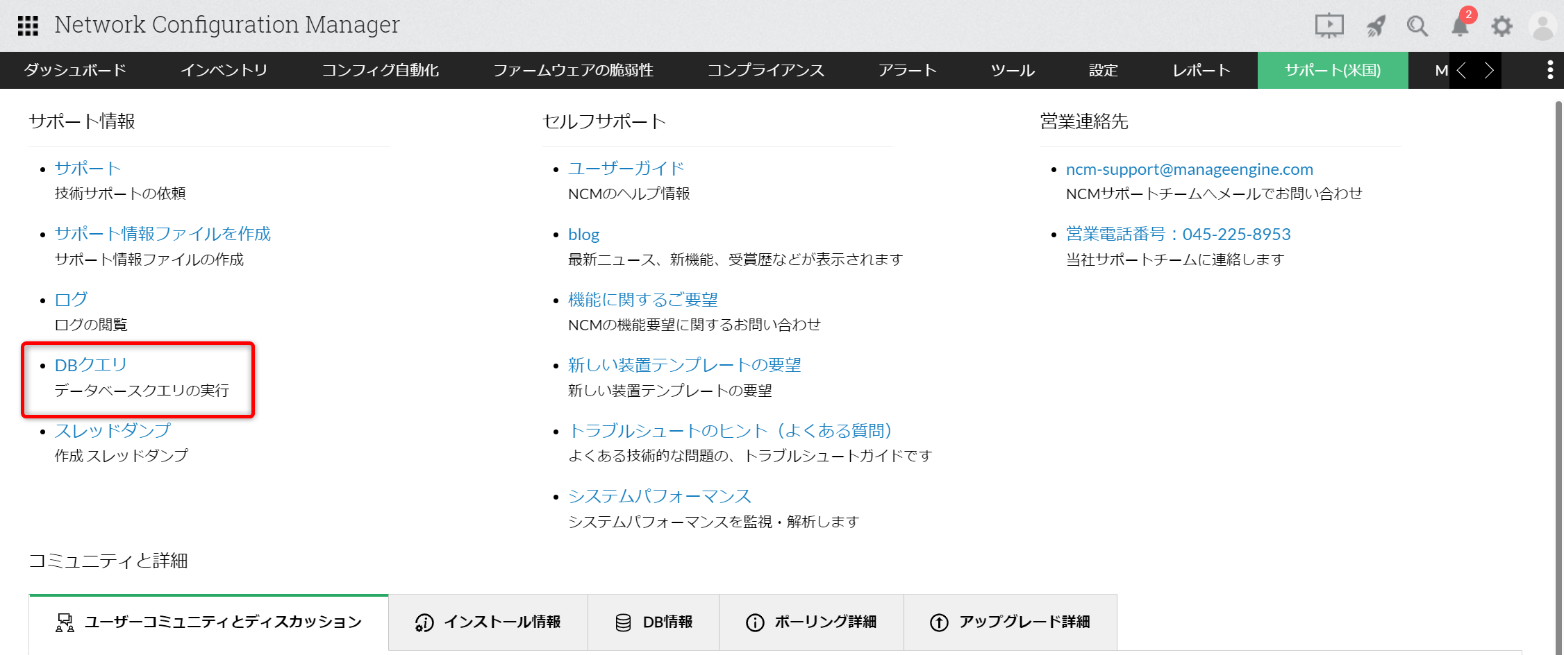 - [サポート(米国)]→[DBクエリ]から表示される画面上で、以下のクエリをペーストし、[Execute]
