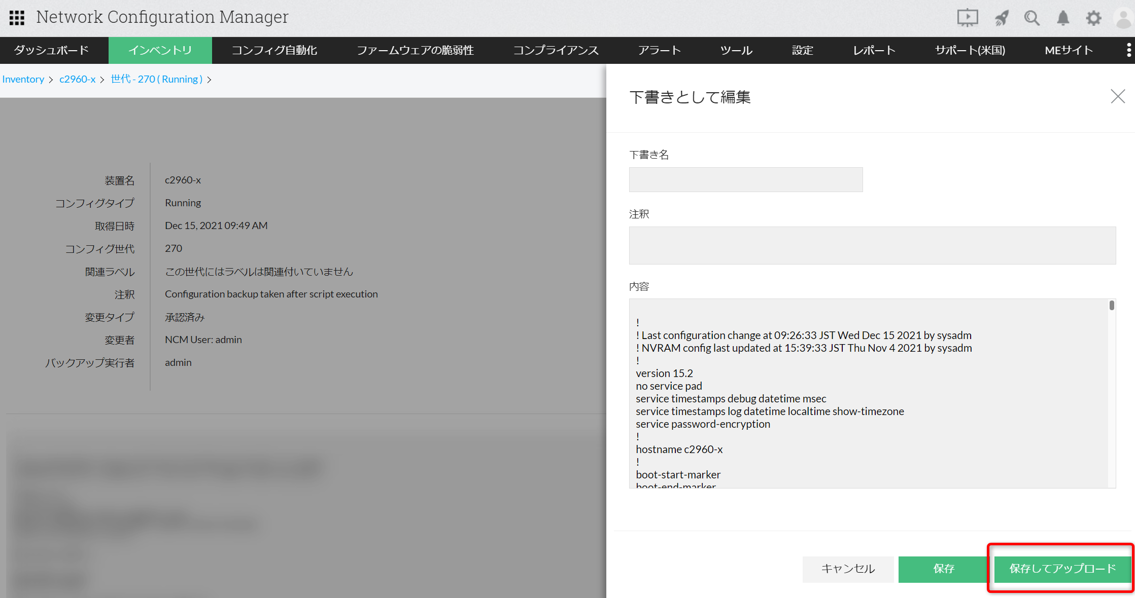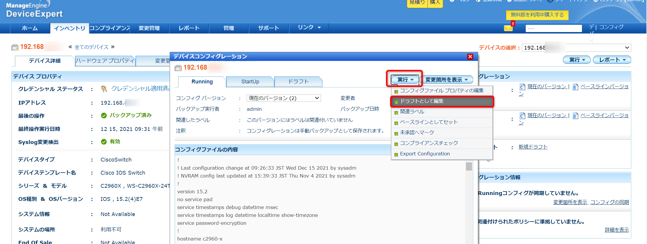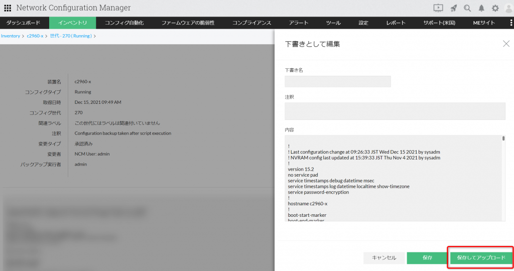 - 画面右上の[≡]から[下書きとして編集]を選択し、任意の下書き名、注釈を入力し、投入するコンフィグ内容を確認