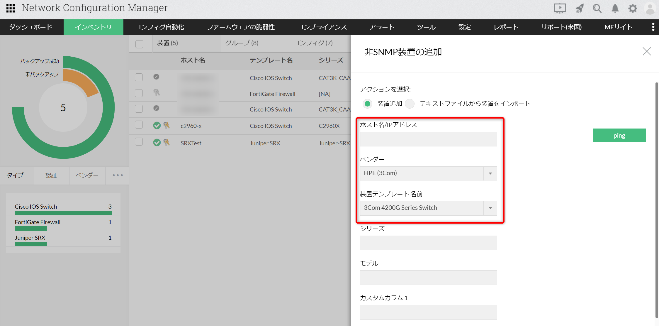 ※対象装置との接続を確立します。 - [インベントリ]→[装置]画面で、追加した対象装置をクリック