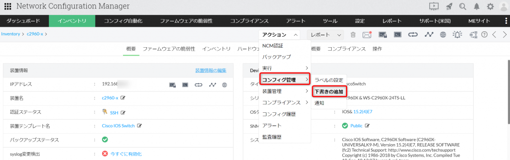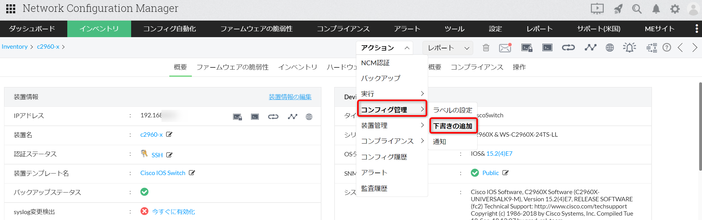 - クリック後の画面上部の[アクション]から[コンフィグ管理]→[下書きの追加]を選択