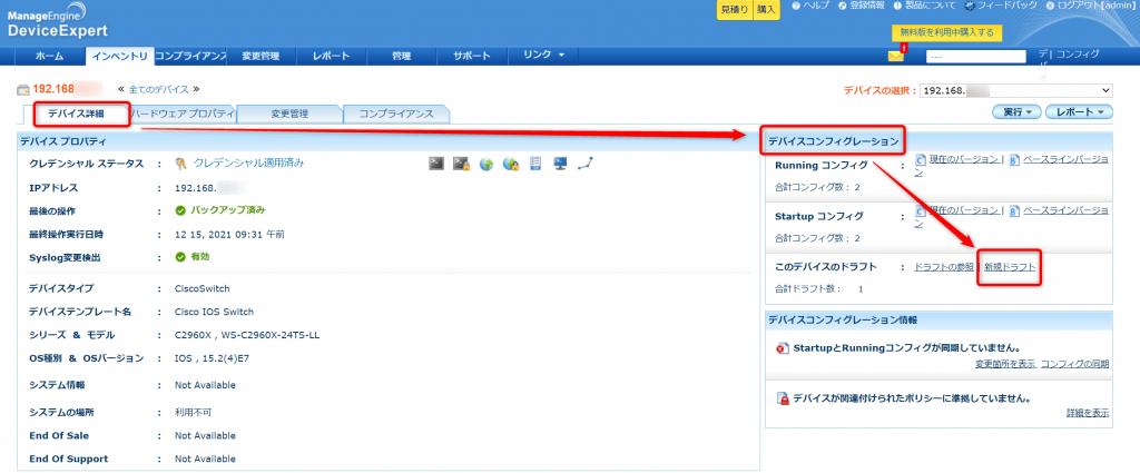 - 保存したドラフトが[デバイス詳細]→[デバイスコンフィグレーション]→[このデバイスのドラフト]に追加されていることを確認