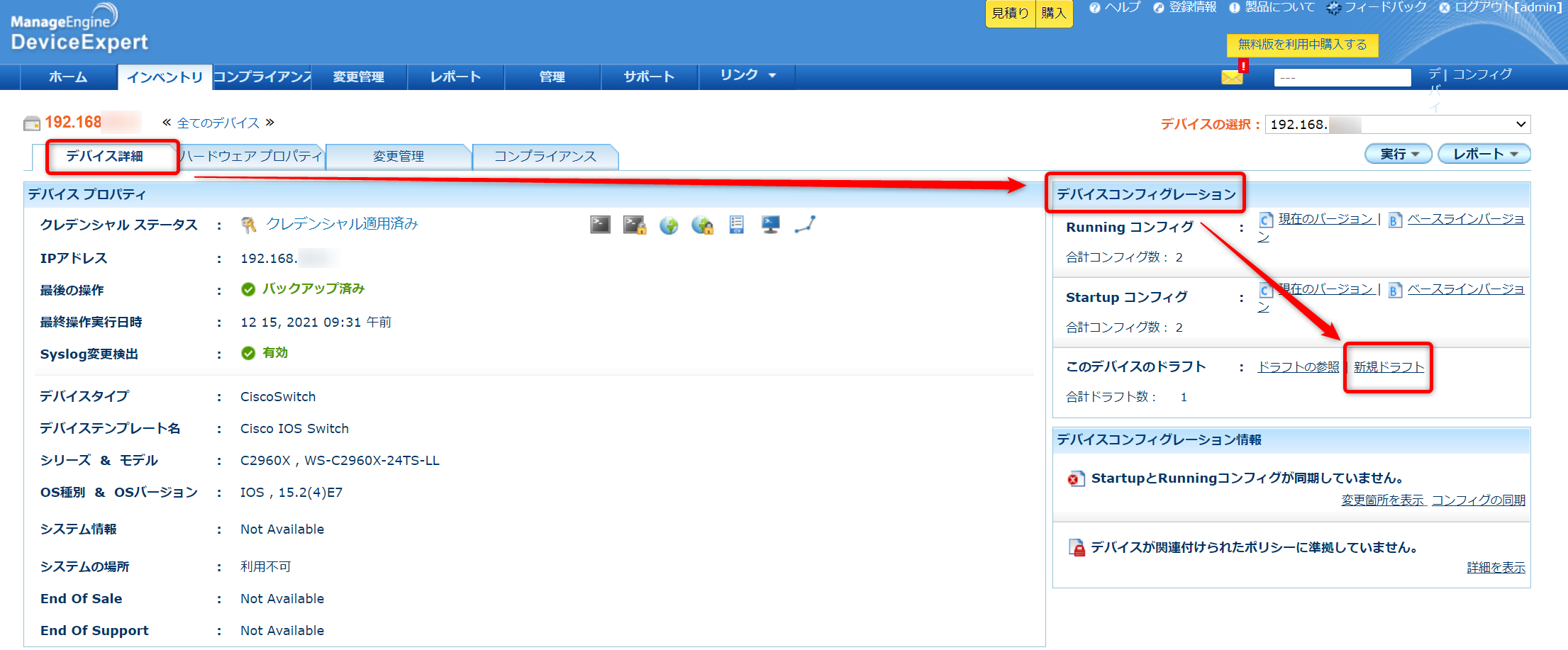 - [デバイス詳細]→[デバイスコンフィグレーション]→[このデバイスのドラフト]から[新規ドラフト]をクリック