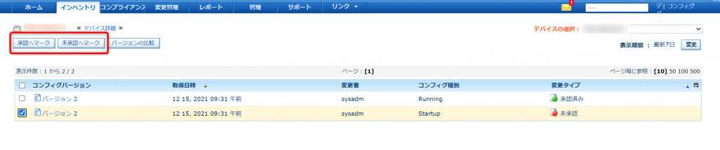 - 対象のコンフィグバージョンを選択し、[承認へマーク]または[未承認へマーク]ボタンをクリック