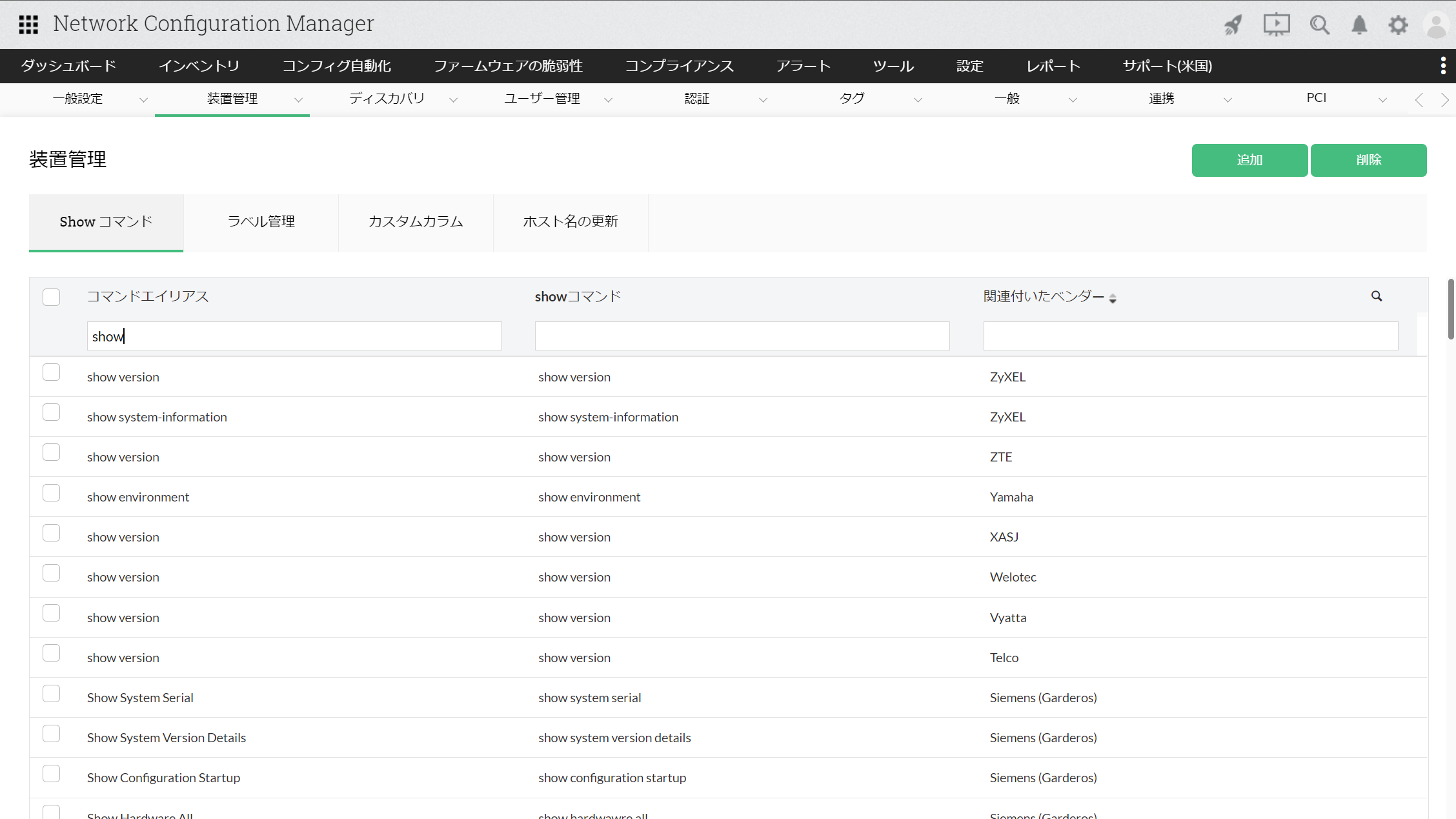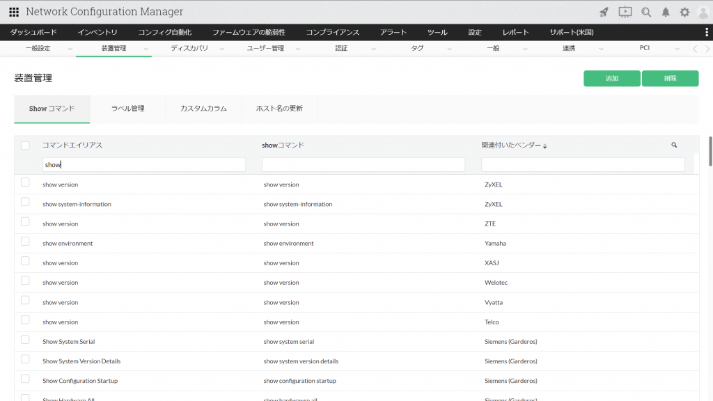 [設定]→[装置管理]→[Showコマンド]設定で、「show version」や「show interfaces」などのコマンドを追加しておくことで、