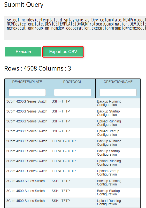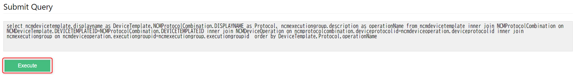 select ncmdevicetemplate.displayname as DeviceTemplate,NCMProtocolCombination.DISPLAYNAME as Protocol, ncmexecutiongroup.description as operationName from ncmdevicetemplate inner join NCMProtocolCombination on NCMDeviceTemplate.DEVICETEMPLATEID=NCMProtocolCombination.DEVICETEMPLATEID inner join NCMDeviceOperation on ncmprotocolcombination.deviceprotocolid=ncmdeviceoperation.deviceprotocolid inner join ncmexecutiongroup on ncmdeviceoperation.executiongroupid=ncmexecutiongroup.executiongroupid order by DeviceTemplate,Protocol,operationName