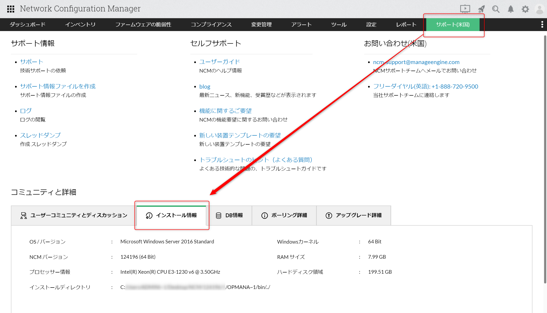 [サポート(米国)]タブ 画面上の[コミュニティと詳細]に、[インストール情報]タブを配置
