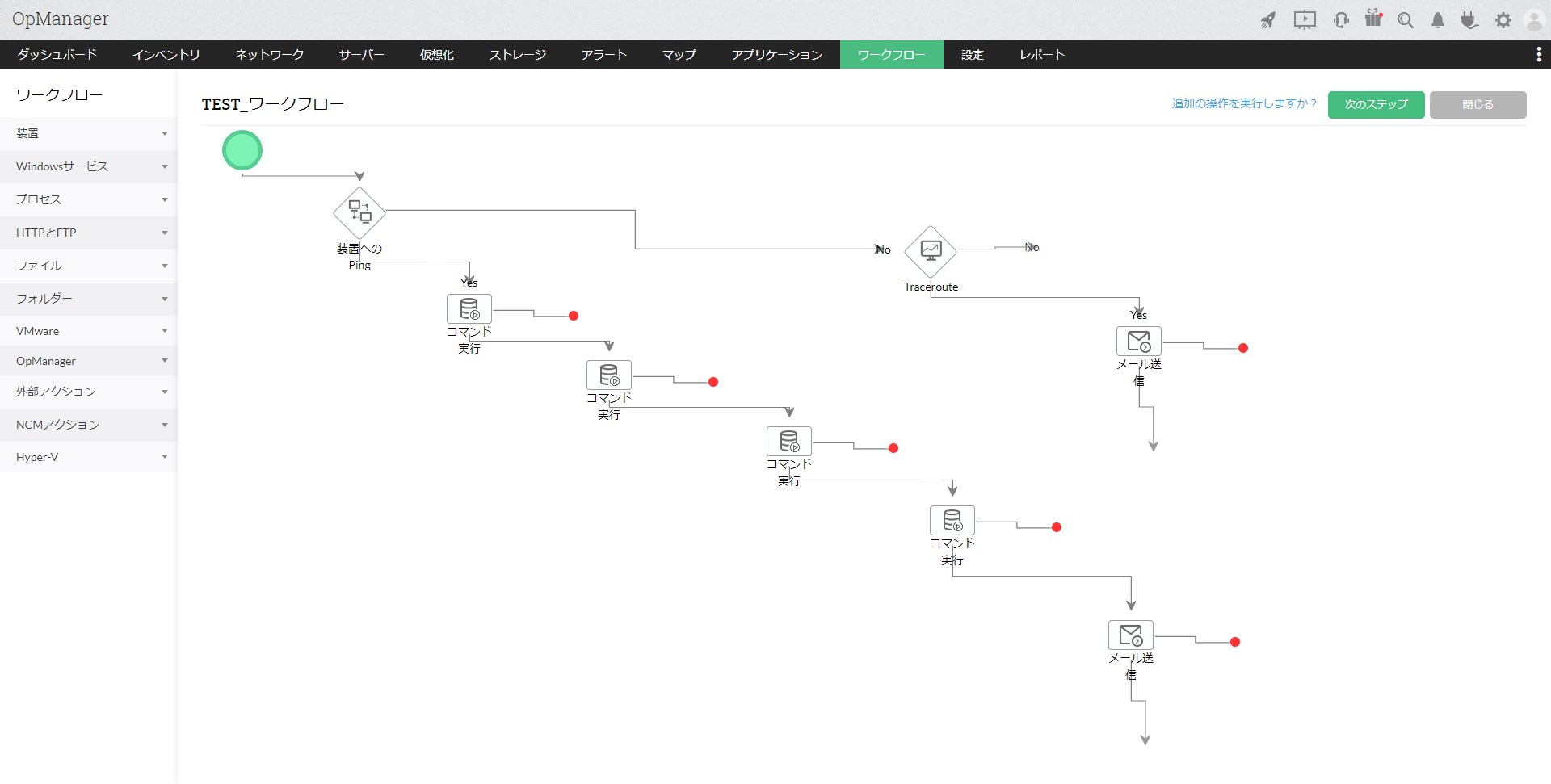 - NCM単体の場合、[ツール]→[ワークフロー]機能からワークフローを設定できますが、上記例に記載の「外部アクション(メール通知)」は実装されておりません。