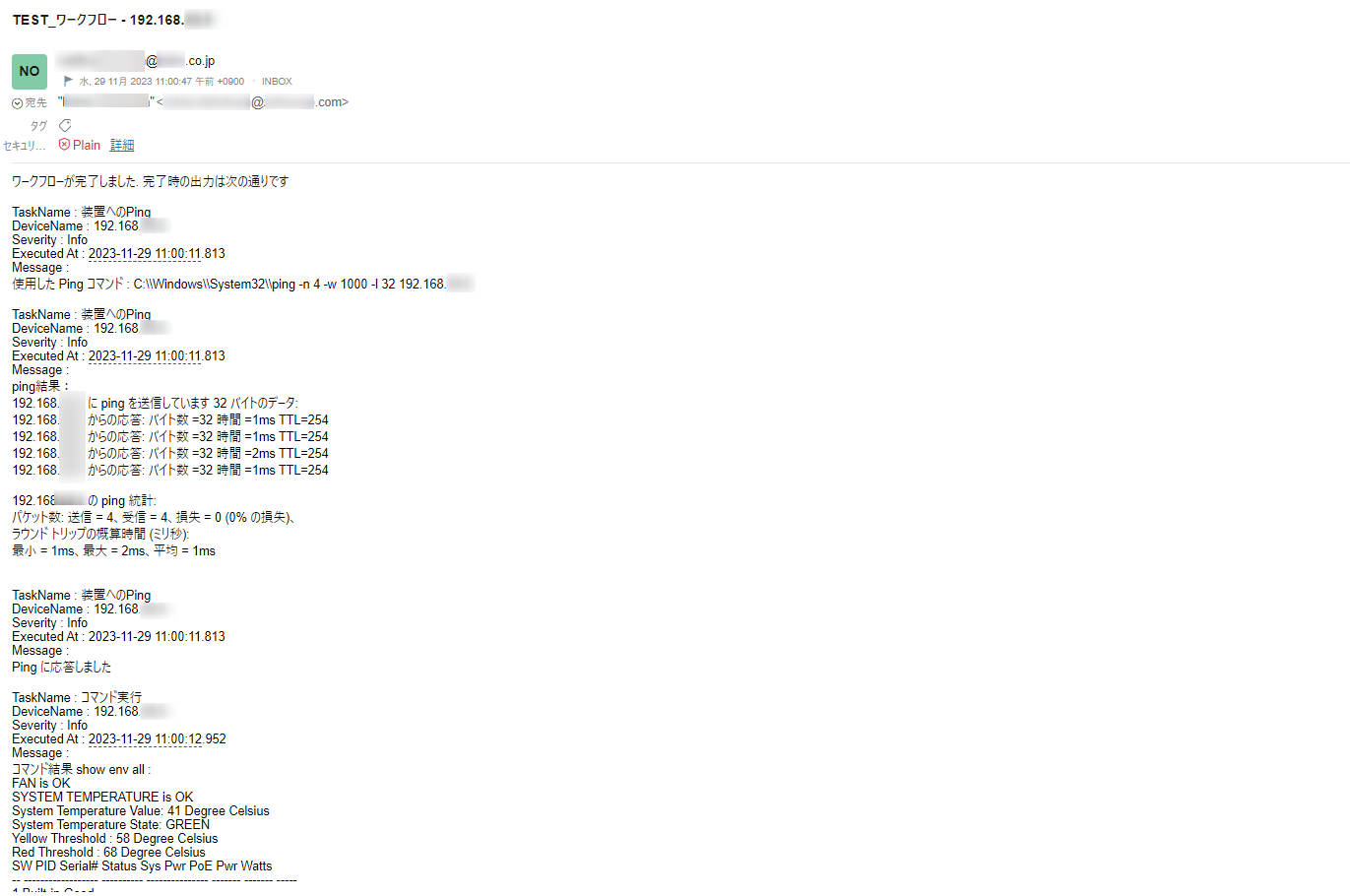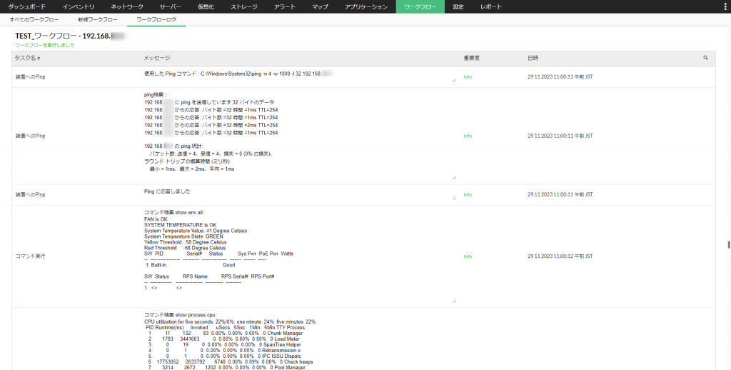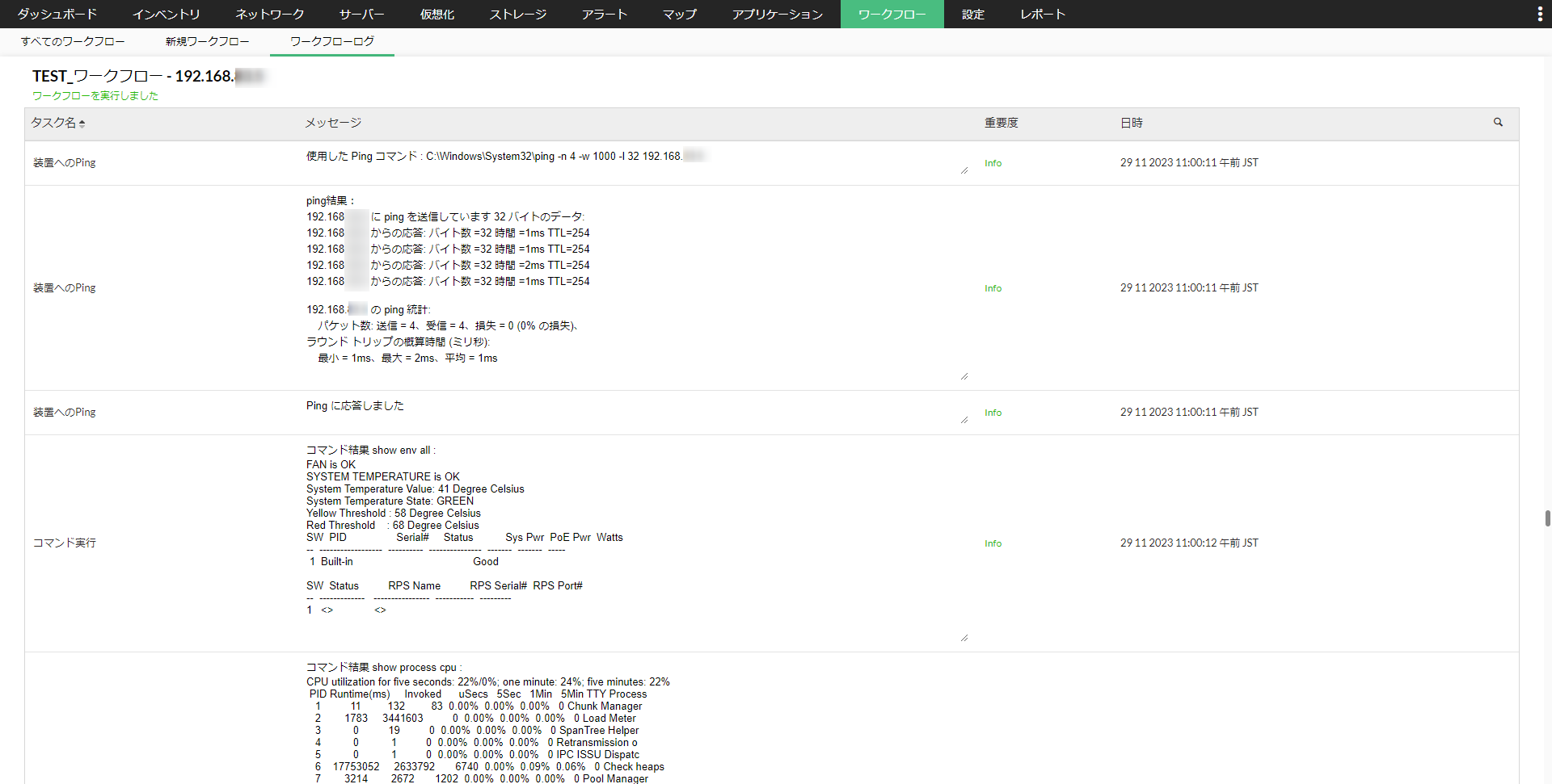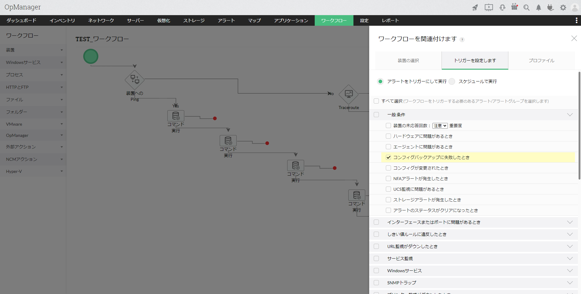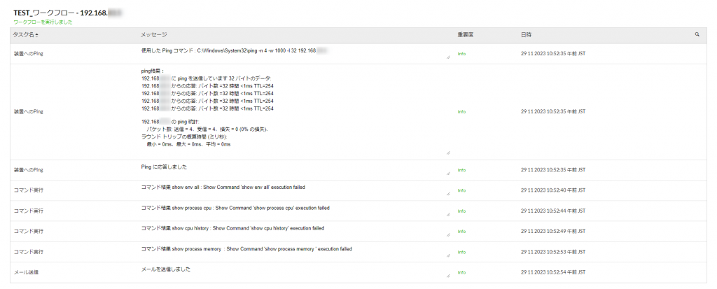 指定したトリガー「コンフィグバックアップに失敗したとき」が発生すると、ワークフローが自動で実行されます。