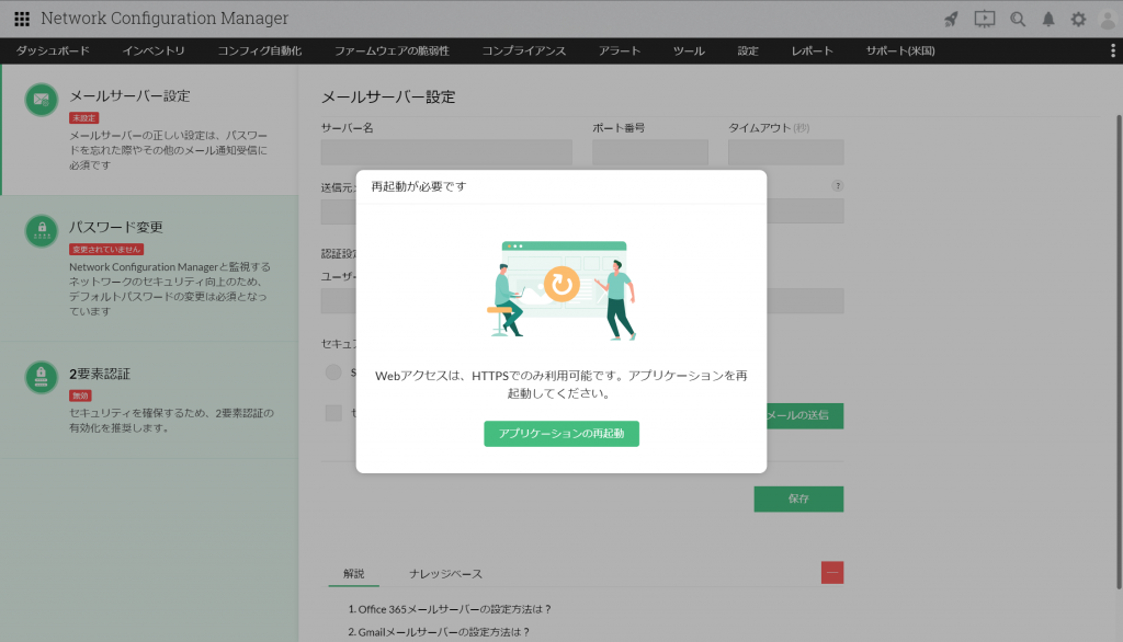 [アプリケーションの再起動]をクリックすると、自動で製品が再起動します。再起動後、HTTPSでアクセスしてください。 - HTTPSを無効化すると、その後、2週間ごとに推奨画面が表示されます(スキップ可)。