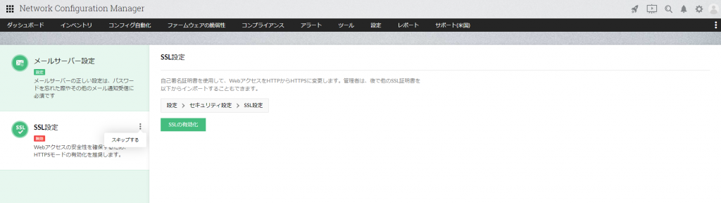 ※ビルド12.7.124以降、推奨画面に[今後表示しない]オプションを実装しました。 - [SSLの有効化]をクリックすると、自動で製品が再起動します。再起動後、HTTPSでアクセスしてください。