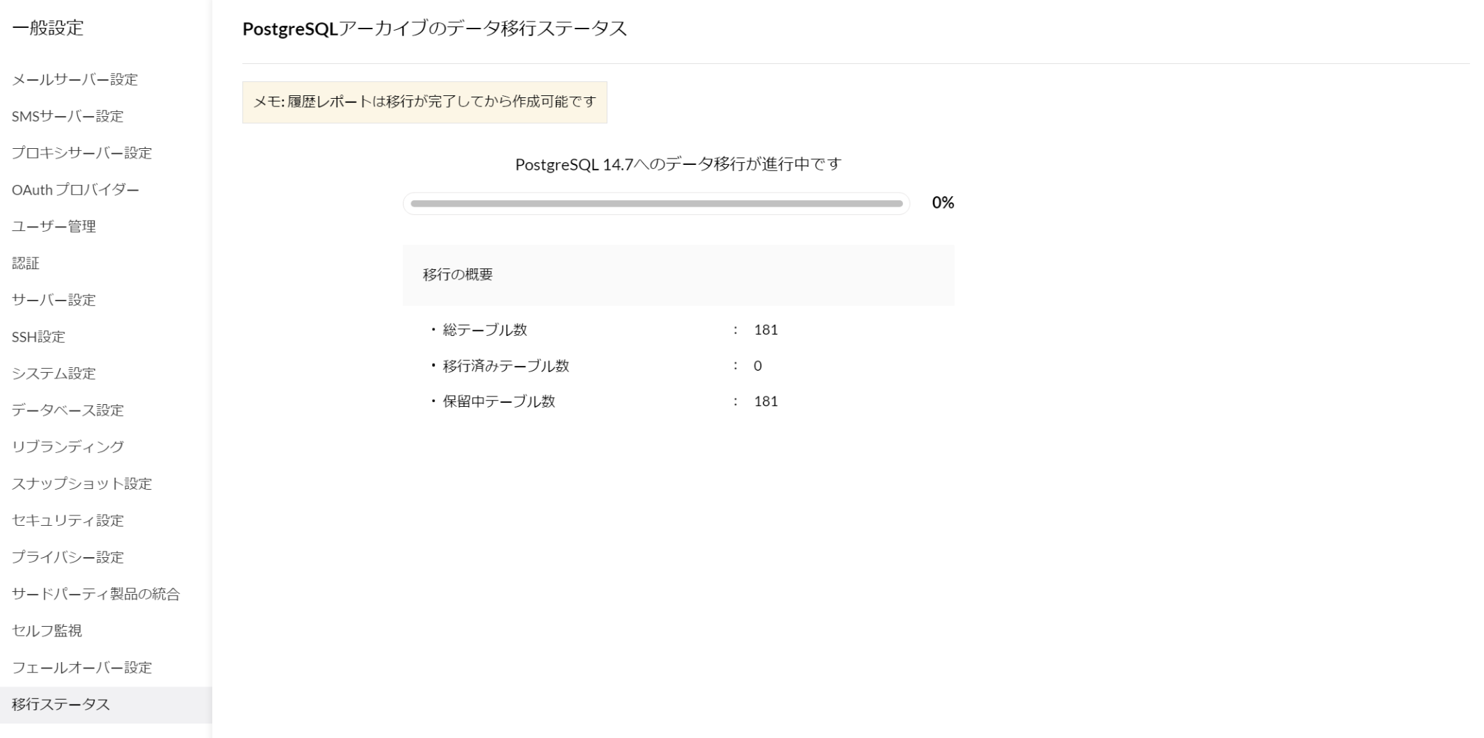 - PostgreSQLのアップグレードに伴いデータ移行が進行している場合、完了まで待機