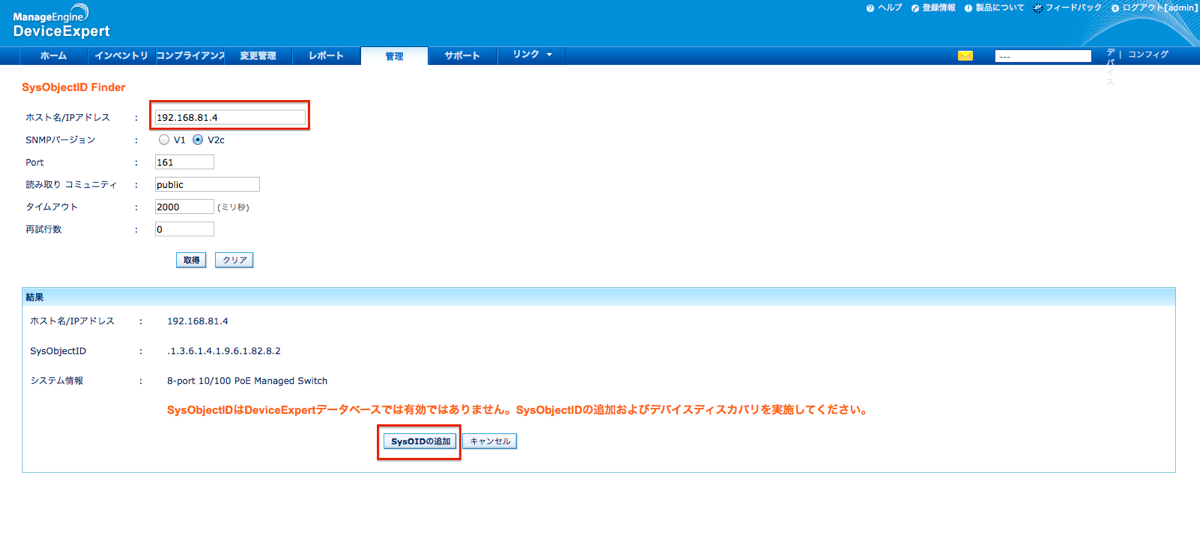 装置ディスカバリを実施する際、対象装置のSysObjectID(以下SysOID)が製品上の装置テンプレートに実装されている場合に、