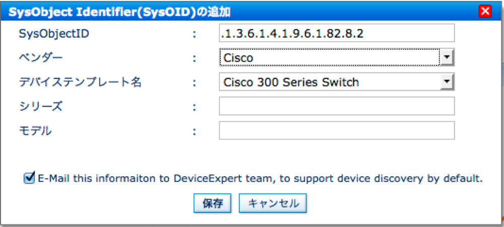 - 検出したSysOIDに対する装置テンプレート名を選択し、[保存]をクリック