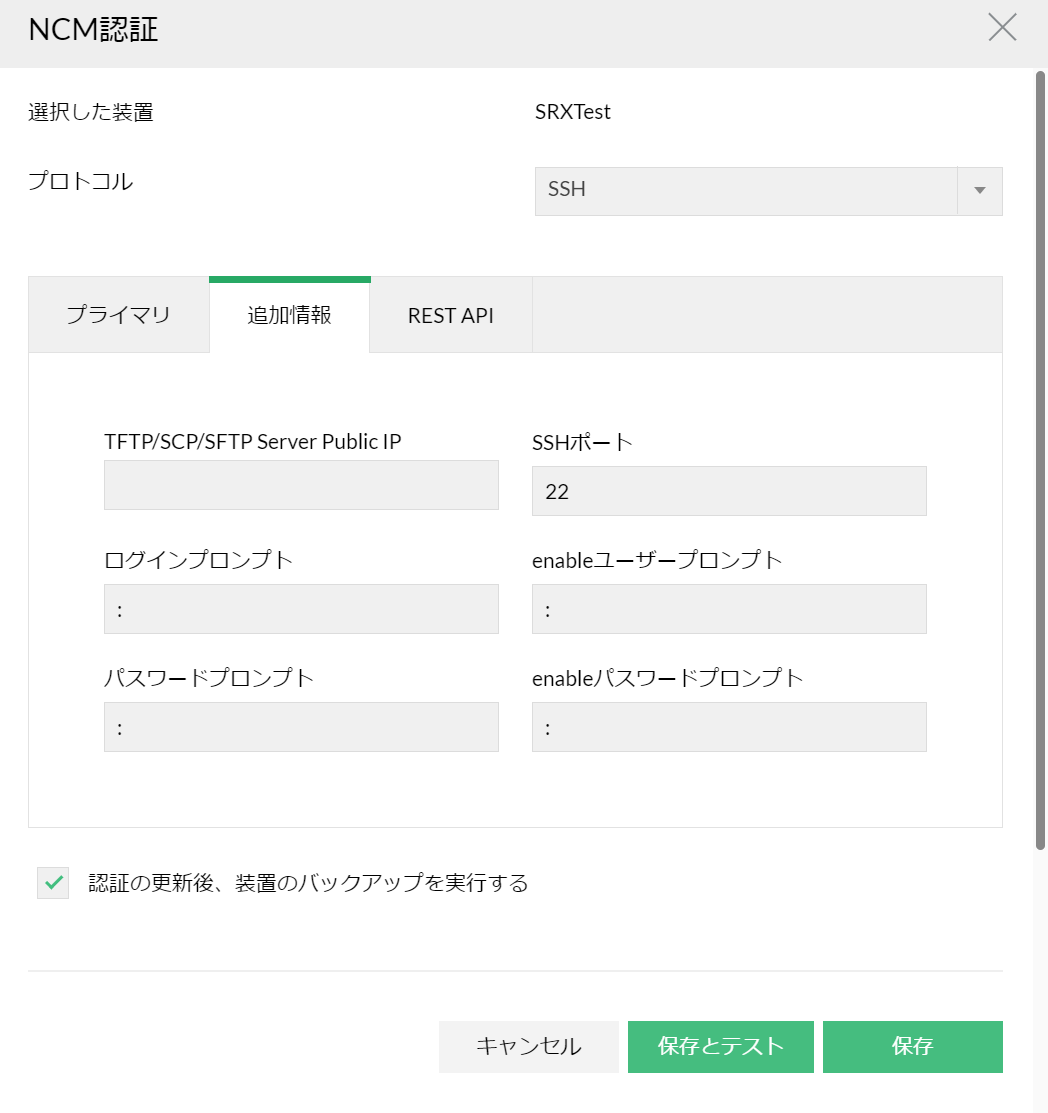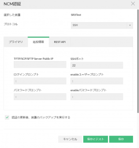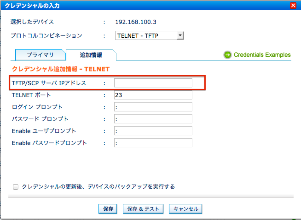 対象装置の認証設定画面の追加情報フィールドの[TFTP/SCPサーバIPアドレス]の欄に、
