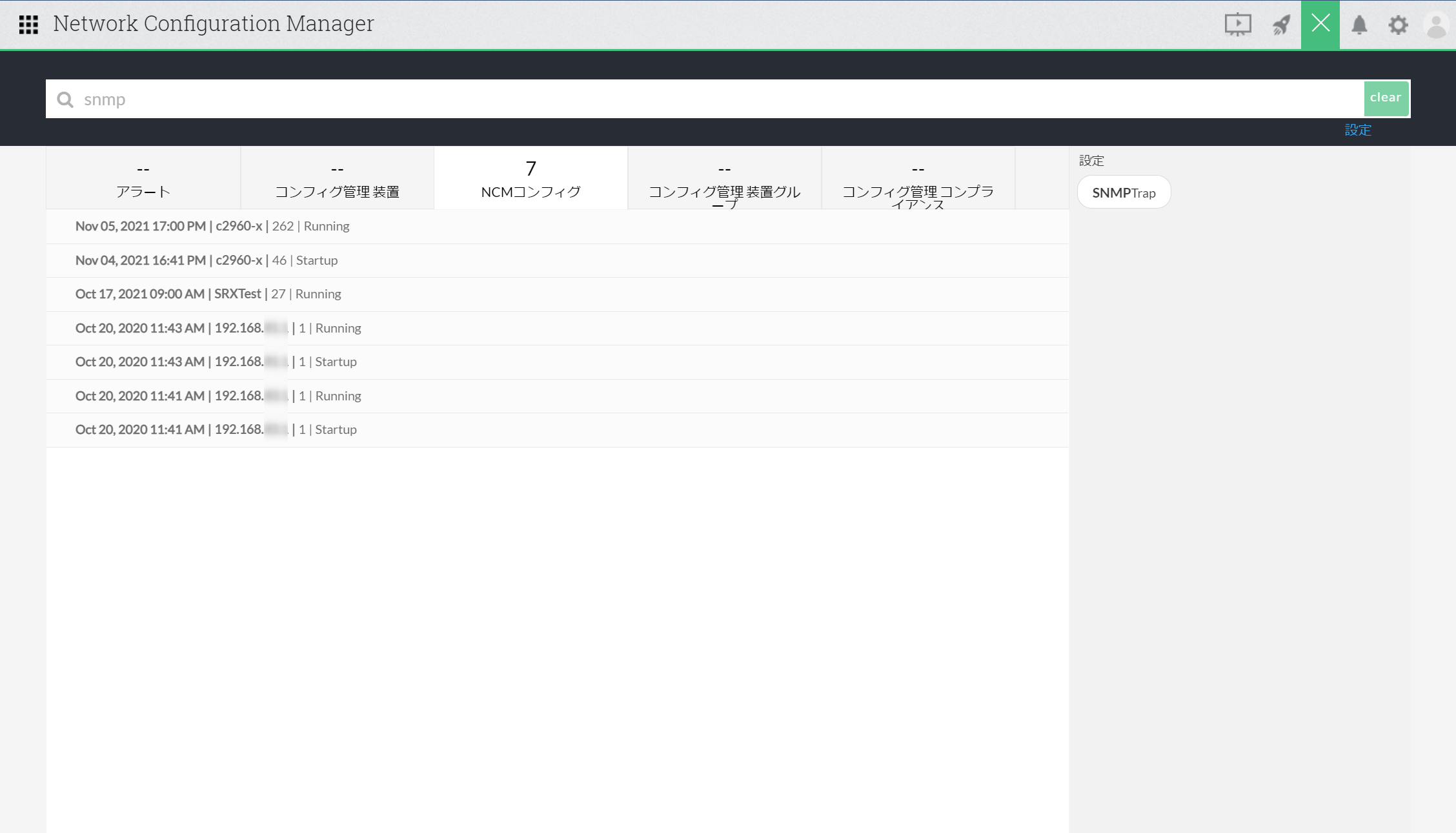 例として、「snmp」を含むコンフィグを検索する場合、各装置の最新のstartup/runningコンフィグがスキャンされ、「snmp」を含むコンフィグ情報が検索結果として表示されます。