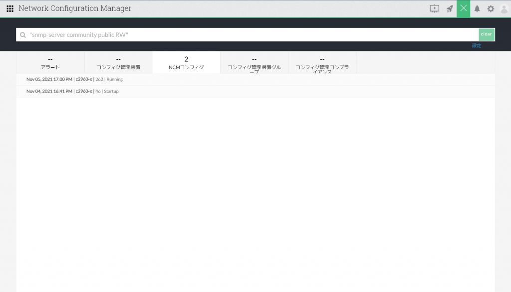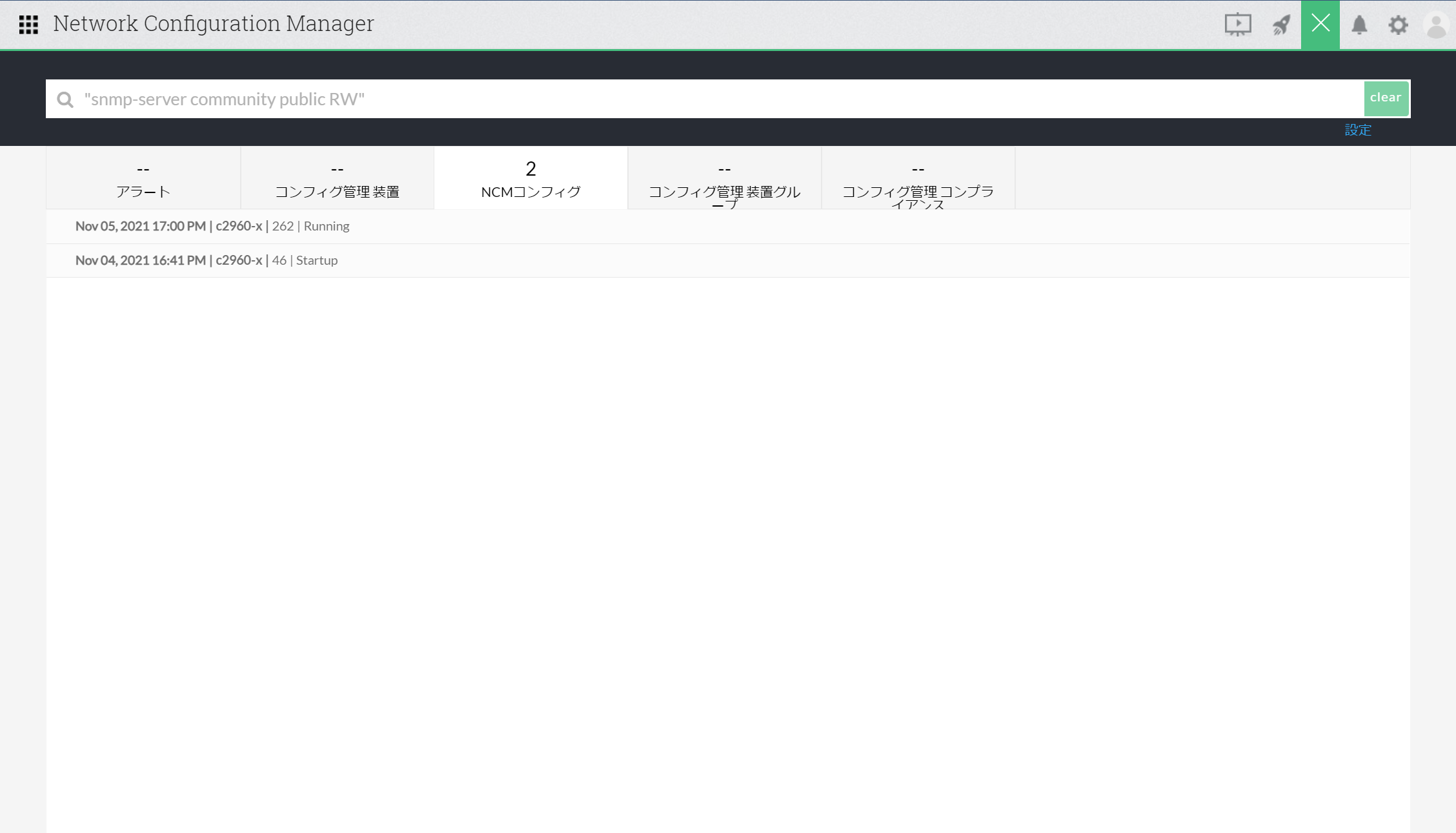 例として、"snmp-server community public RW"と検索すると、各装置の最新のstartup/runningコンフィグがスキャンされ、"snmp-server community public RW"というフレーズ(順番も含めて完全一致)を含むコンフィグ情報が検索結果として表示されます。