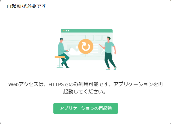 [アプリケーションの再起動]をクリックすると、自動で製品が再起動します。再起動後、HTTPSでアクセスしてください。 - HTTPSを無効化すると、その後、2週間ごとに推奨画面が表示されます(スキップ可)。