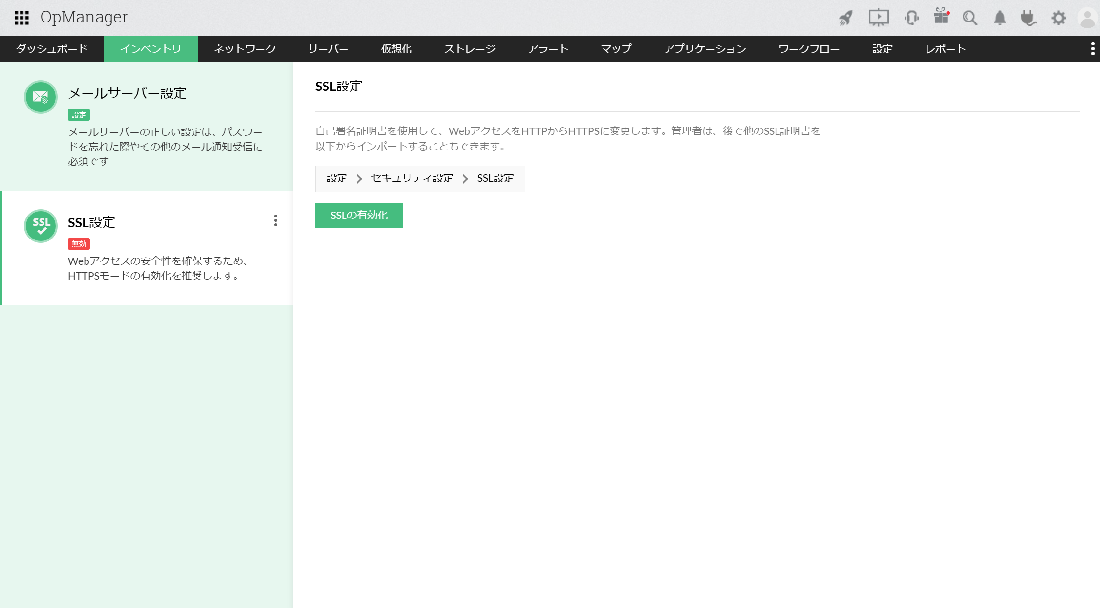 推奨画面は、デフォルトの「admin」ユーザーアカウントのみに表示されます。 - [SSLの有効化]をクリックすると、自動で製品が再起動します。再起動後、HTTPSでアクセスしてください。