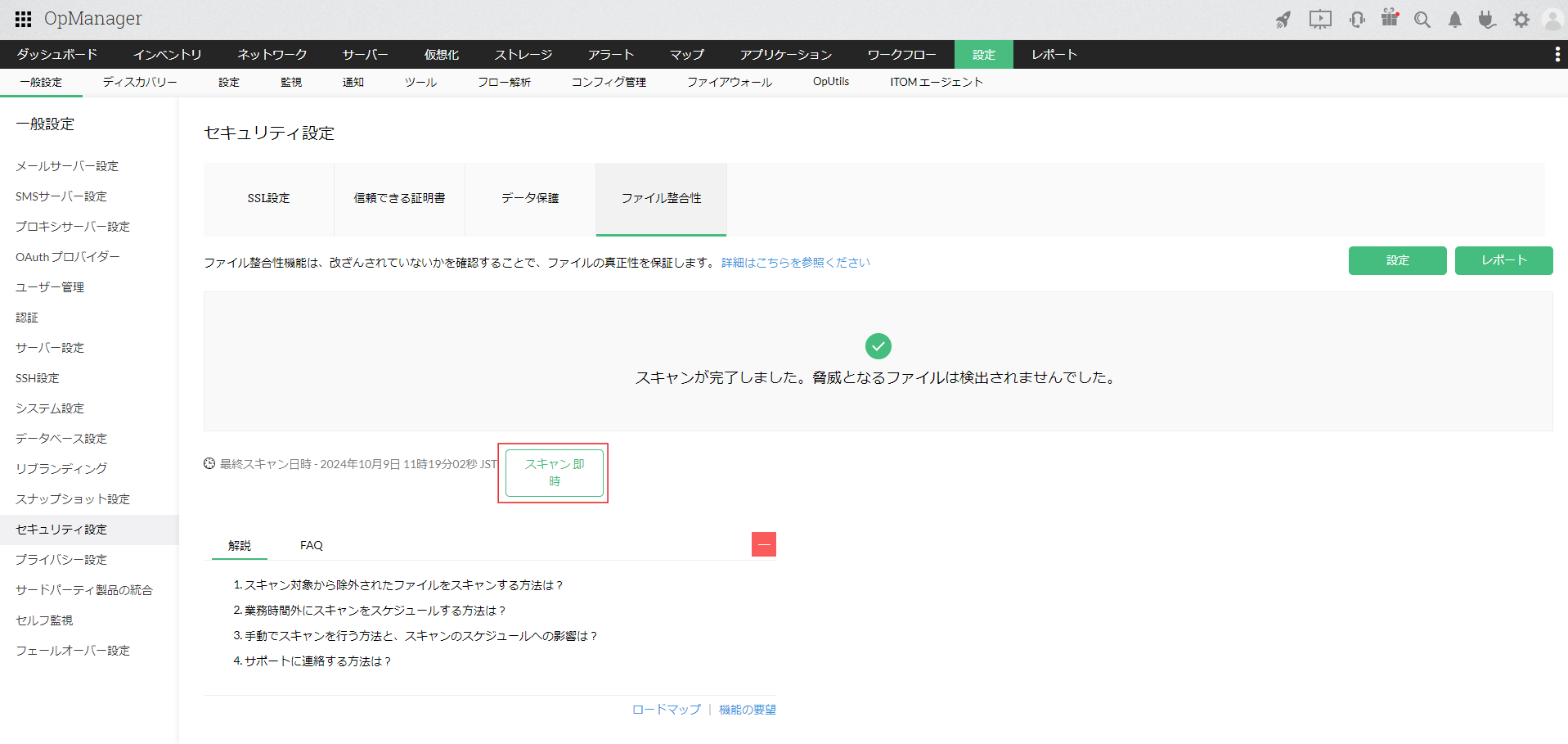 - [設定]→[一般設定]→[セキュリティ設定]→[ファイル整合性]タブ→[スキャン 即時]をクリックします。