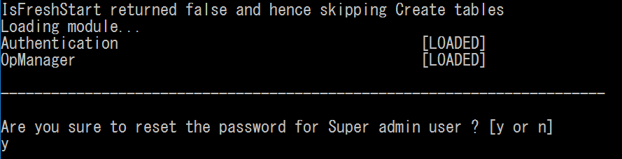- 「Are you sure to reset the password for Super admin user ? [y or n]」と表示されたら「y」を入力し、Enterキーを押します。