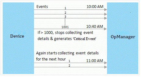 OpManagerでは、短期間に同じ装置から同じ種類のSNMPトラップ、SyslogおよびWindows イベントログが大量に送信された場合に、特定のイベントを更新するプロセスを停止し、アラートを発生させます。