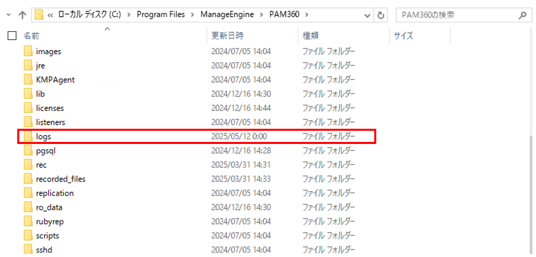 ※デフォルトのインストールディレクトリーのパス:C:\Program Files\ManageEngine\PAM360 - <PAM360インストールディレクトリー>\logsフォルダを圧縮し、ZIPファイル化します。