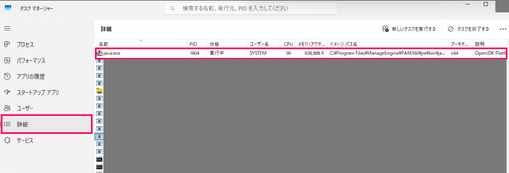 | PAM360.exe | トレイアイコンに関連するプロセス ※PAM360をインストールしたユーザーがサーバにログインしていない場合は起動しません。 |