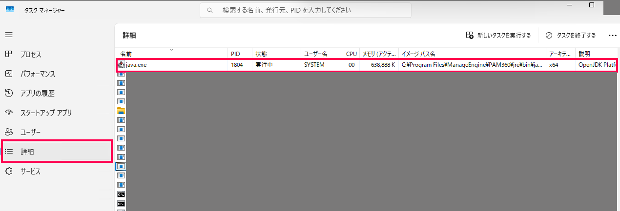 | postgres.exe | デフォルトでPAM360がバンドルしているPostgreSQLに関連するプロセス |